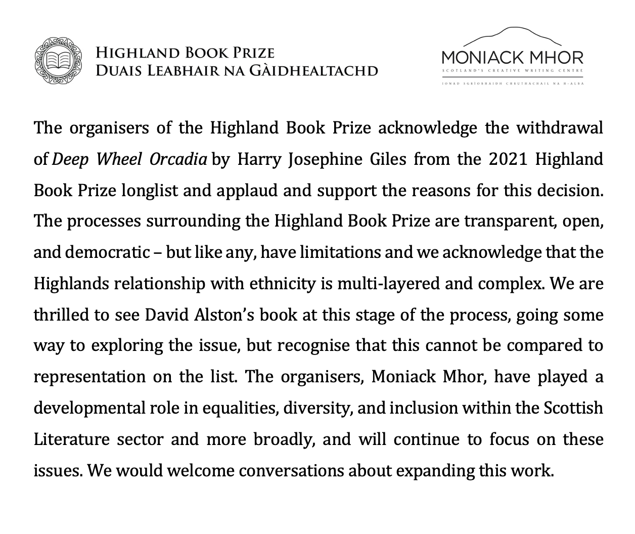 * The organisers of the Highland Book Prize acknowledge the withdrawal of Deep Wheel Orcadia by Harry Josephine Giles from the 2021 Highland Book Prize Longlist. Our statement is available to read here.